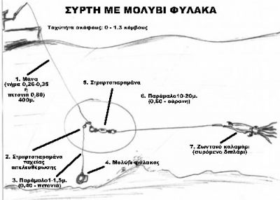 Ένας από τους πιο πετυχημένους τρόπους ψαρέματος με καλαμάρι ως δόλωμα (συρτή με μολύβι φύλακα), φαίνεται στην παρακάτω εικόνα.